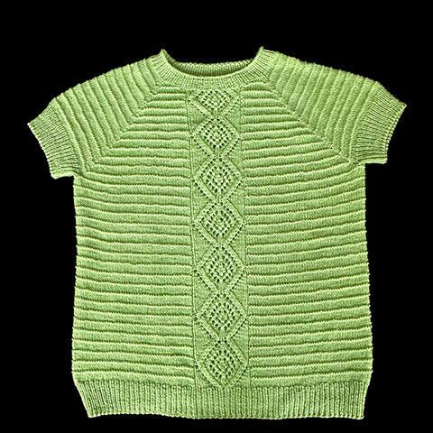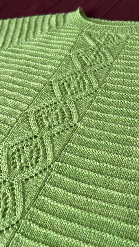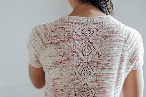 Diamantformet hulmønster på for- og bagstykke, smukke raglan-ærmer, og elegante teksturriller i glatstrik og vrang.