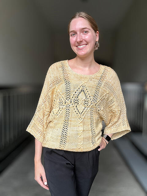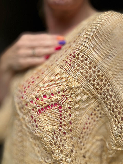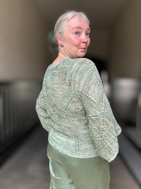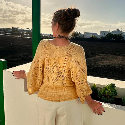 Stephenville Crossing er en sweater med et næsten bohemeagtigt udtryk – let og smuk i formen, og med et imponerende spil af snoninger og hulmønster, der flettes hen over skuldre og vingefang.
