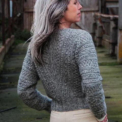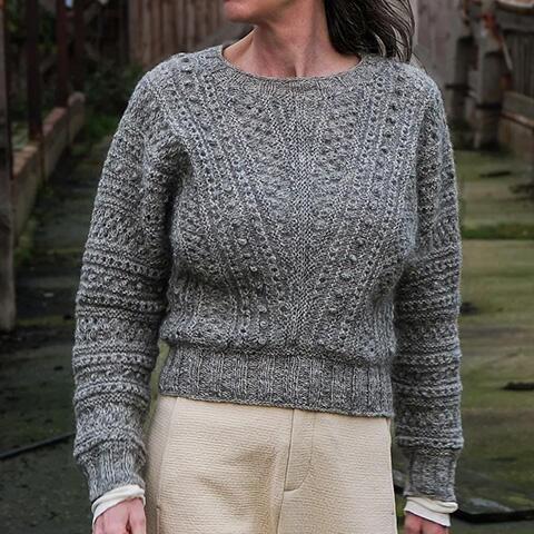 For- og bagstykke strikkes sideværts og sømløst som ét sammenhængende stykke, og siderne dannes med en dobbelt, midlertidig opslagning, som giver et rent og elegant resultat uden traditionelle sidesømme. Senere formes halsen med vendepinde, og til sidst samles arbejdet med en modificeret 3-needle bind-off, som giver en flot, flad samling midt for og midt bag. Ærmerne strikkes oppefra og ned i omgang, så du kan prøve trøjen undervejs og justere længden, hvis du ønsker det.